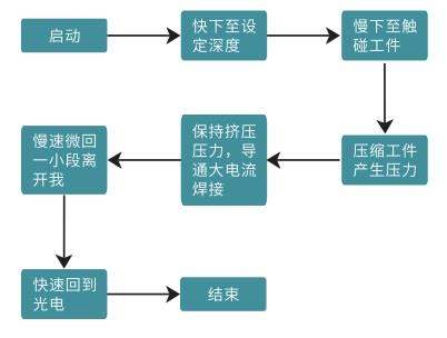 整个过程可以分为启动、快下、慢下、起压、保压焊接、微回、快回、结束,这几个部分。启动后,电机带动焊接电极快速下降接近工件,快要接近时降速慢下,当触碰工件后继续下压进入起压环节。通过压力传感器反馈施加的压力,当施加的压力到达设定值,恒定后通一定的电流固定时间。在焊接的过程中由于电阻产热所以工件会融化,为了保证焊接的效果需要继续下降,实现保持设定压力的目的。在焊接完成后,电机先慢速微回一段距离开工件,再快速返回原点,完成一个周期。